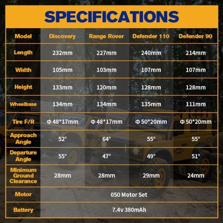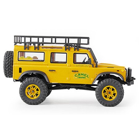 The FMS 1/24 FCX24M Land Rover Defender 110 RTR (Ready-To-Run) in the vibrant yellow Camel Trophy edition is a micro-crawler that blends the exceptional realism of a detailed hard body with the extreme capabilities of the FCX24M chassis. The Defender 110 is the long-wheelbase version, ideal for tackling technical terrain and providing an impressive 1/24 scale presence. It comes fully assembled and ready to run, including the advanced two-speed transmission and a full lighting system.